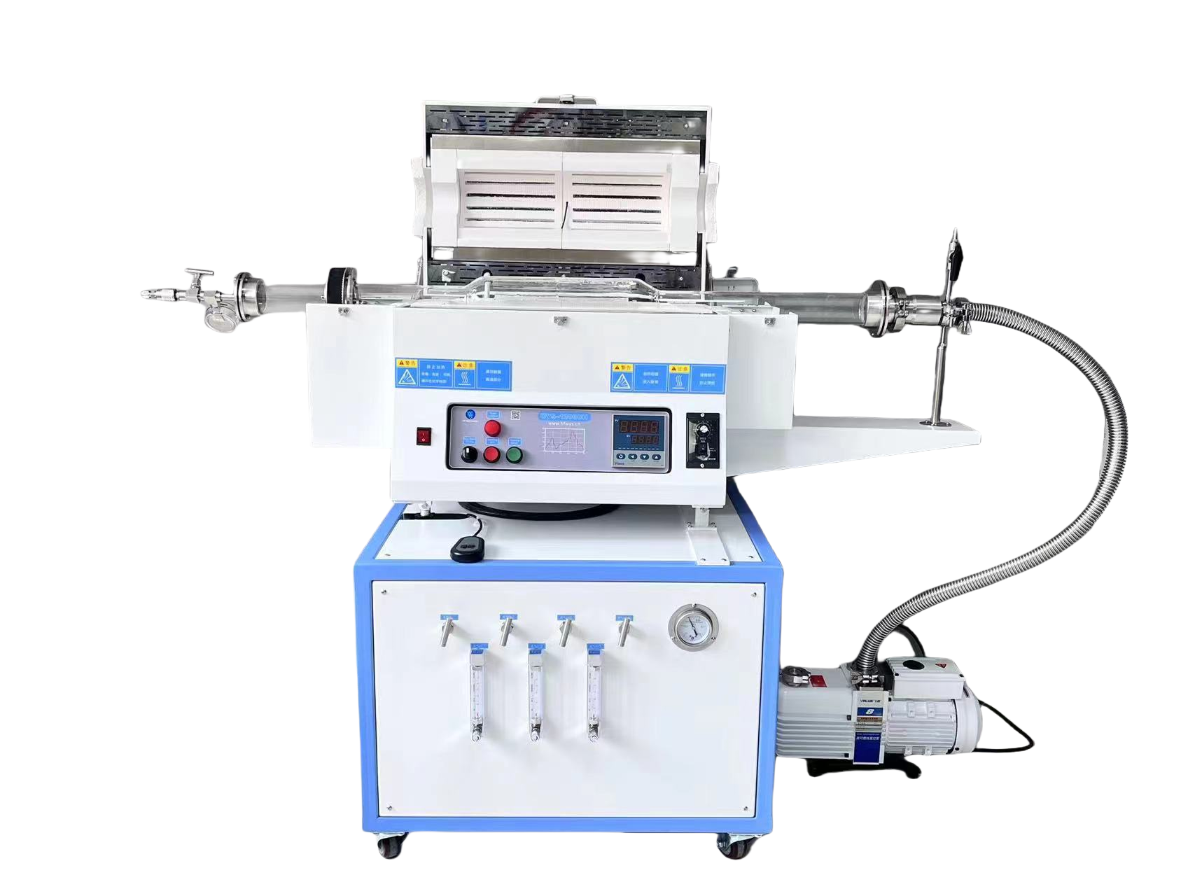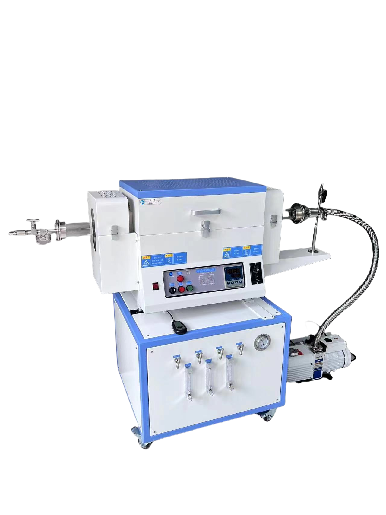 · 氣路管道采用四氟軟管,和不銹鋼氣管,帶有混氣罐,通入氣體單進(jìn)單出,也可混氣后進(jìn)入爐管