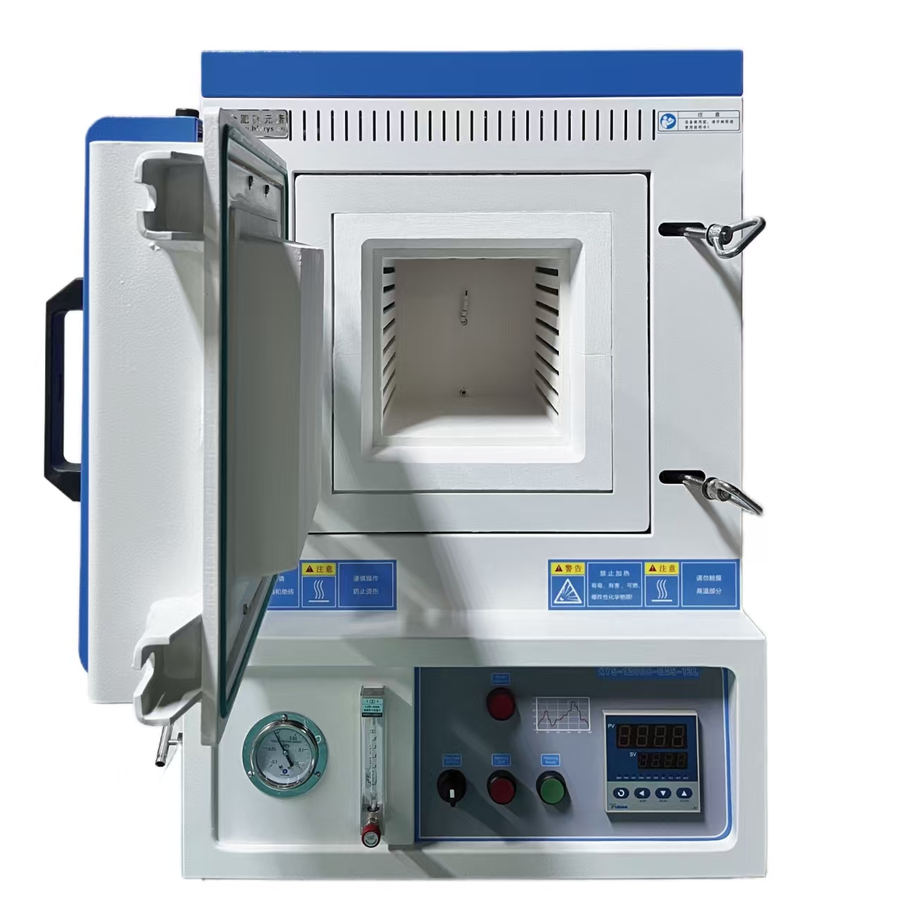 產品概述:一款氣氛箱式爐,其最高溫度可以達到1200℃。可以在真空或氣氛保護環境下對樣品進行熱處理。對于控溫系統,可設置50段升降溫程序PID曲線控溫,控溫精度±1℃,三面加熱溫場均勻。